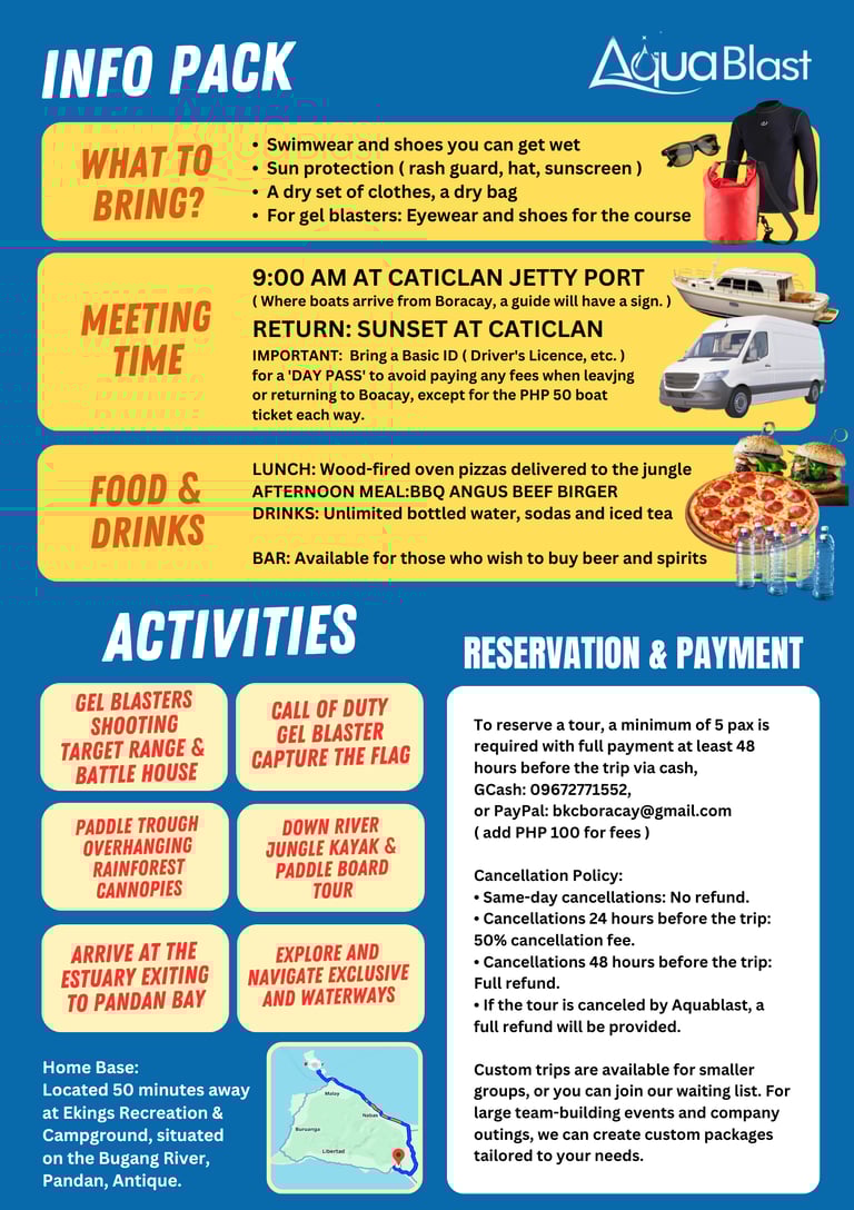 SMILES & A KICKASS ADVENTUROUS ATTITUDE **1 PIECE OF ID FOR THE FERRIES FOR A DAY PASS !! We go rain or shine we are getting wet anyway: Sun Protection/Hat/ Rash Guard/clothes you can get wet, DRY BAG Set of Dry Clothes/Towel, Running shoes/good footwear and eyewear for Gel Blasters/Trekking in water & Jungle